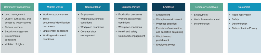 The company identifies key human rights issues related to the hotel's business activities and anticipates potential risks in terms of human rights. These issues are divided into 7 points as follows: