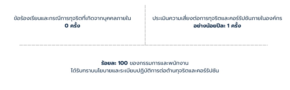 ในเดือนกุมภาพันธ์ 2567 บริษัทฯ ได้ประกาศเจตนารมณ์เข้าร่วมแนวร่วมต่อต้านคอร์รัปชันของภาคเอกชนไทย (CAC) และอยู่ระหว่างการยื่นขอการรับรอง CAC Certification โดยเมื่อวันที่ 2 มกราคม 2568 บริษัทฯ ได้ประกาศใช้นโยบายต่อต้านการทุจริตและคอร์รัปชัน (ฉบับแก้ไข) เพื่อให้สอดคล้องกับกฎหมาย และมีผลบังคับใช้กับกรรมการ ผู้บริหาร พนักงาน บริษัทย่อย ตลอดจนส่งเสริมให้บริษัทร่วมและตัวแทนทางธุรกิจถือปฏิบัติตามนโยบายดังกล่าว บริษัทฯ ยึดมั่นในหลักการไม่ยอมรับการทุจริตทุกรูปแบบ ไม่ว่าจะทางตรงหรือทางอ้อม โดยบุคลากรทุกคนต้องปฏิบัติตามนโยบาย ระเบียบปฏิบัติ และจรรยาบรรณธุรกิจอย่างเคร่งครัดโดยไม่มีข้อยกเว้น
