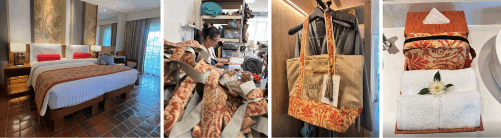 | เศรษฐกิจหมุนเวียน | - ผลิตภัณฑ์จากของเหลือใช้มีมูลค่าเพิ่ม - เสริมสร้างภาพลักษณ์ความยั่งยืนให้กับโรงแรม | - กระเป๋าผลิตจากวัสดุหมดอายุ กลายเป็นของใช้/ของที่ระลึก - ลูกค้าให้ความสนใจและซื้อเป็นของฝาก |