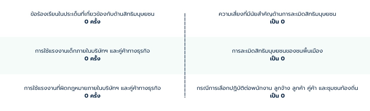 ทั้งนี้ บริษัทฯ ดำเนินธุรกิจด้วยความระมัดระวังเพื่อมิให้เกิดการละเมิดสิทธิมนุษยชนตลอดห่วงโซ่ธุรกิจตามหลักปฏิบัติสากล กฎหมายท้องถิ่นและนโยบายสิทธิมนุษยชนของบริษัทฯ นอกจากนี้ บริษัทฯ สนับสนุนให้พนักงานและผู้มีส่วนเกี่ยวข้องให้ความเคารพความแตกต่างทางทางเพศ เชื้อชาติ ความเชื่อทางศาสนา ความคิด ความแตกต่างทางร่างกาย สีผิว ถิ่นกำเนิด ความพิการ อายุ และความแตกต่างหลากหลายอื่นๆ อย่างไรก็ดี ในกรณีที่มีกรณีฝ่าฝืนนโยบายของบริษัทฯ ทางบริษัทฯ จะดำเนินพิจารณาข้อร้องเรียนด้วยความเป็นธรรม และเยียวยาผู้ที่ได้รับผลกระทบตามหลักเกณฑ์ วิธีการและมาตรการที่บริษัทฯ กำหนด