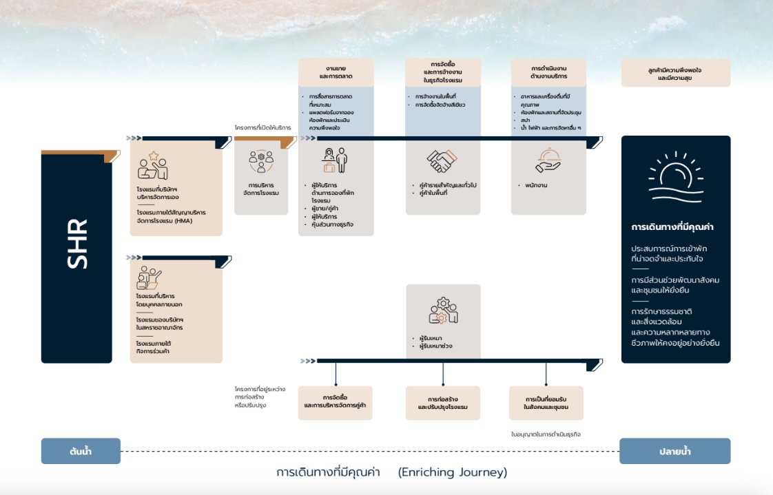 ห่วงโซ่คุณค่าธุรกิจของ SHR ครอบคลุมกิจกรรมหลักที่เชื่อมโยงกันอย่างมีประสิทธิภาพ ตั้งแต่กระบวนการภายในโรงแรมที่บริษัทฯ บริหารจัดการเองไปจนถึงการพัฒนาโครงการใหม่และการปรับปรุงโรงแรมที่มีอยู่ โดยมีเป้าหมายในการสร้างประสบการณ์ที่ดีให้แก่ลูกค้า การส่งเสริมความยั่งยืนในสังคมและสิ่งแวดล้อม และการเสริมสร้างความสามารถในการแข่งขันในตลาด