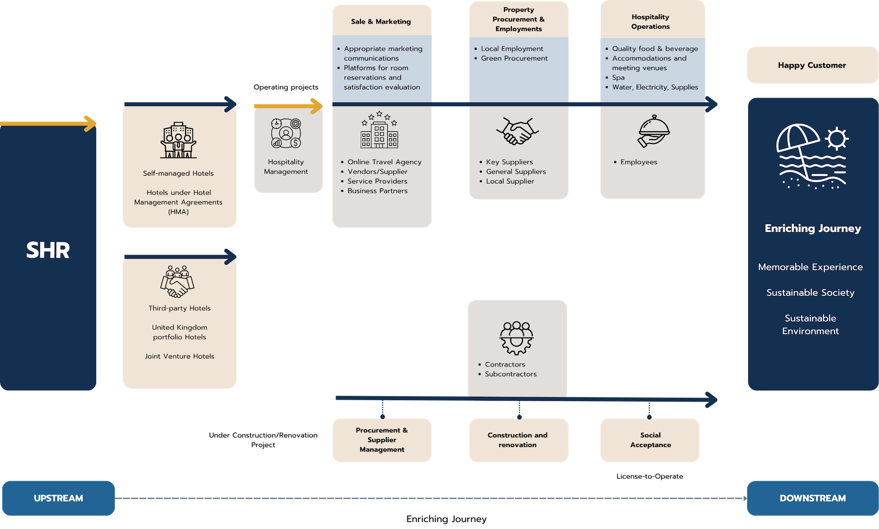 SHR’s business value chain encompasses key activities that are efficiently interconnected—from internal processes in self-managed hotels to the development of new projects and the renovation of existing properties. The aim is to deliver exceptional guest experiences, promote social and environmental sustainability, and strengthen the Company's competitiveness in the market.
