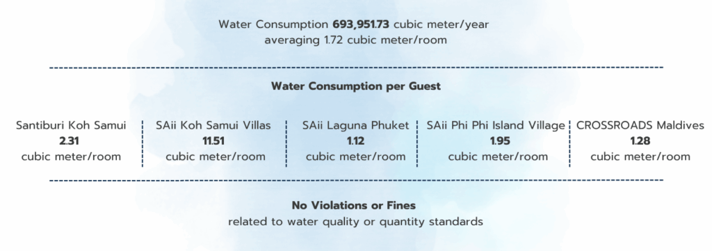 Note: In 2024, water consumption data reporting began for SAii Koh Samui Villas. Due to room and swimming pool renovations during the year, the water consumption per unit was relatively high compared to the Company’s other hotels.